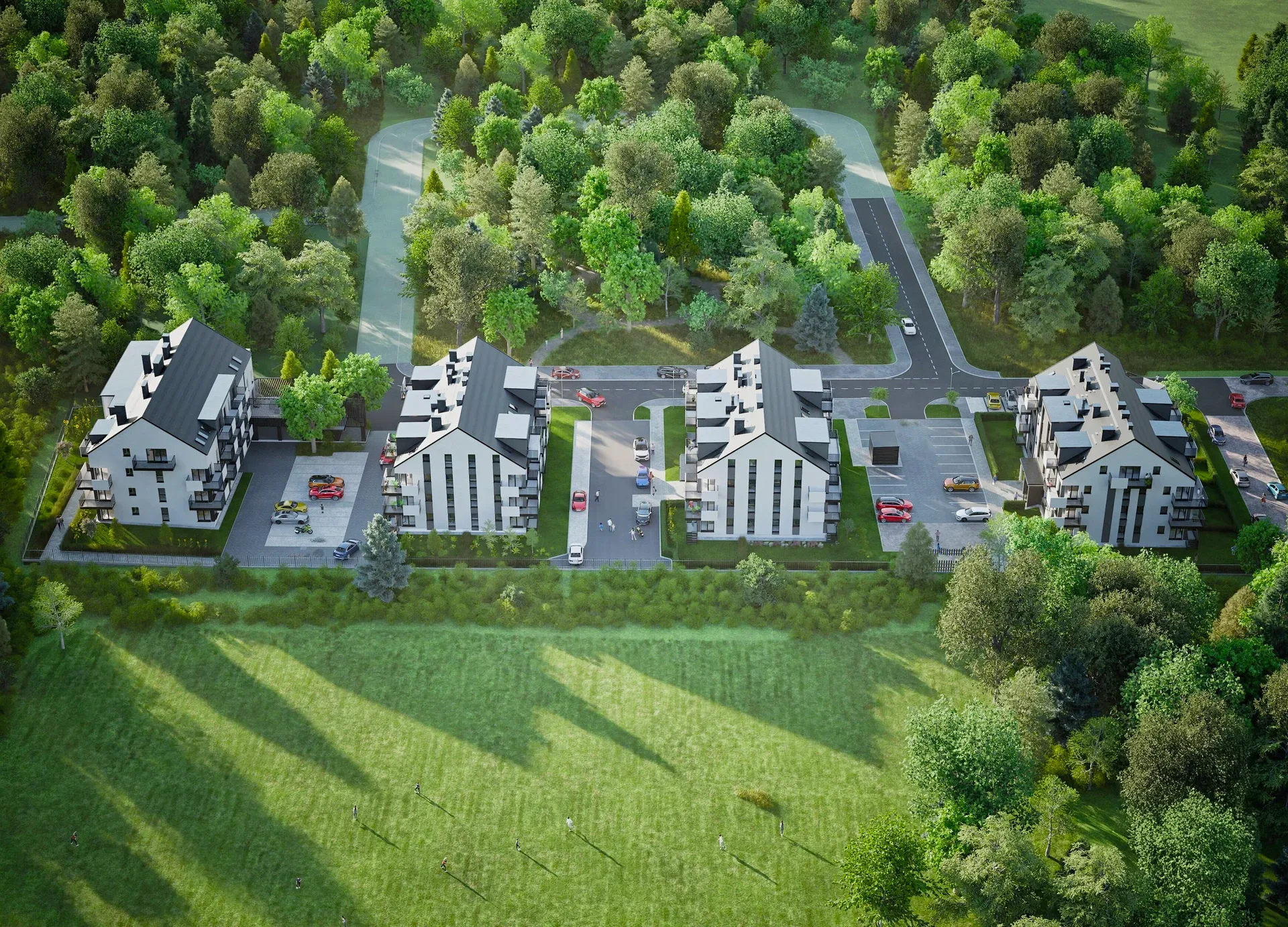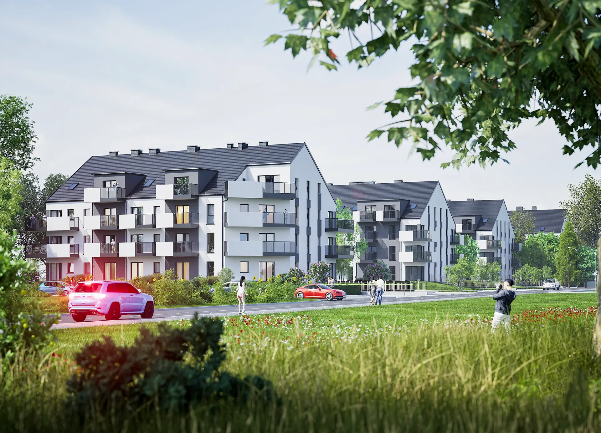 Znaczne odległości między budynkami na osiedlu dają poczucie prywatności i przestrzeni.